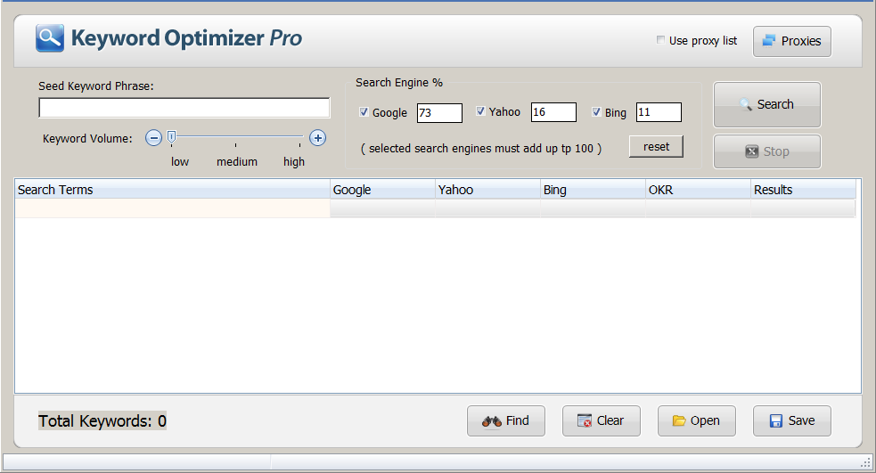 - you can adjust the weighting of each search engine, wherefrom the tool takes keyword suggestions. All search engines must have 100%.